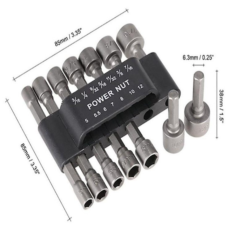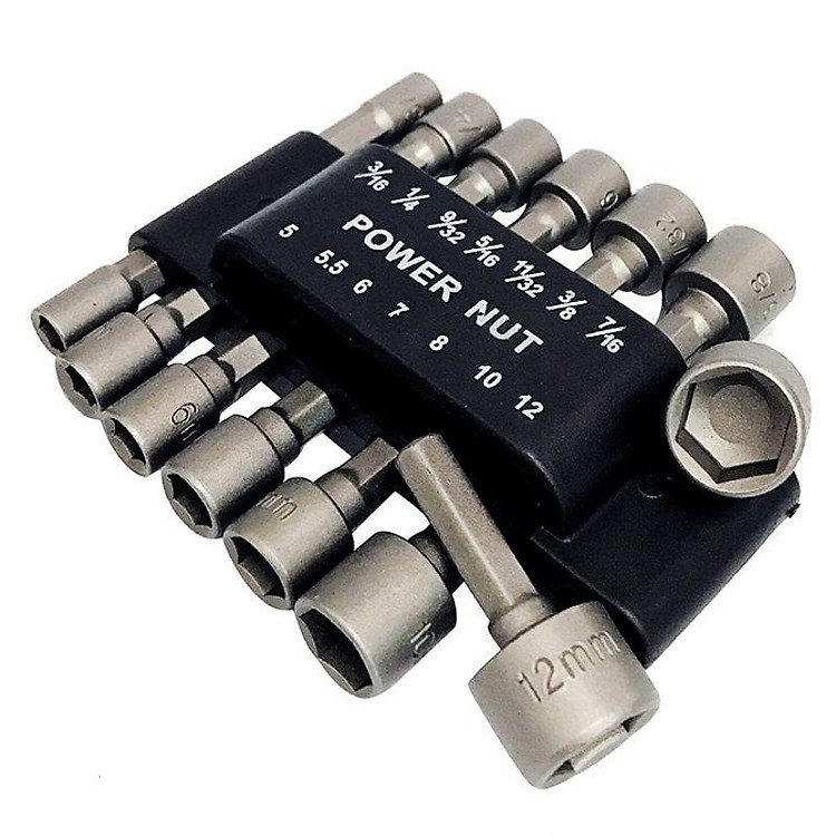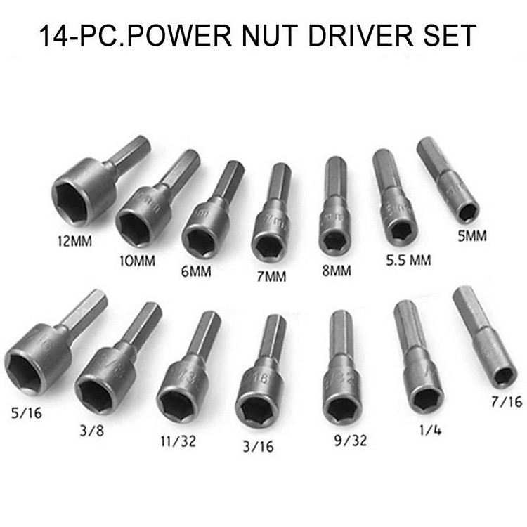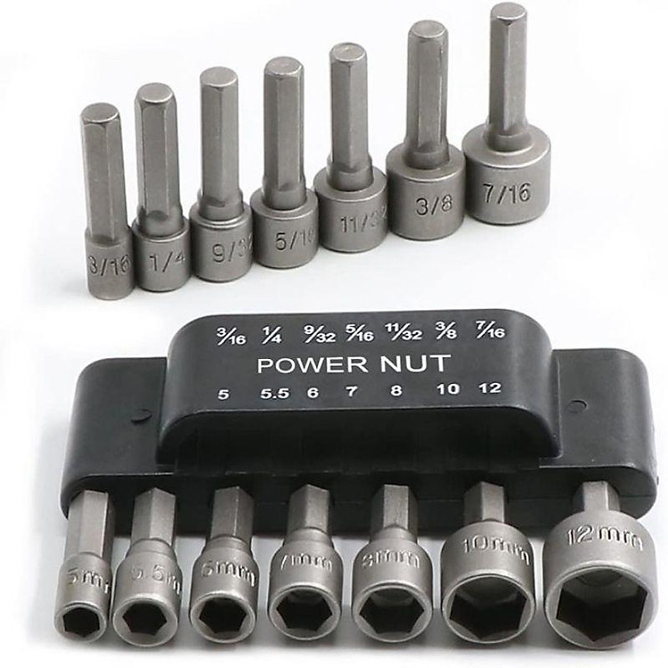 Sử dụng bộ 14 đầu vặn ốc để vặn ốc bằng máy khoan một cách nhanh chóng thuận tiện Có 7 tuýp vặn hệ mét cho ốc lục giác 5mm,5.5 mm,6mm,7mm,8mm,10mm,12mm Có 7 tuýp vặn hệ inch 3/16″, 1/…
