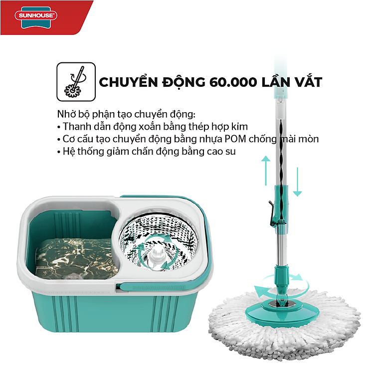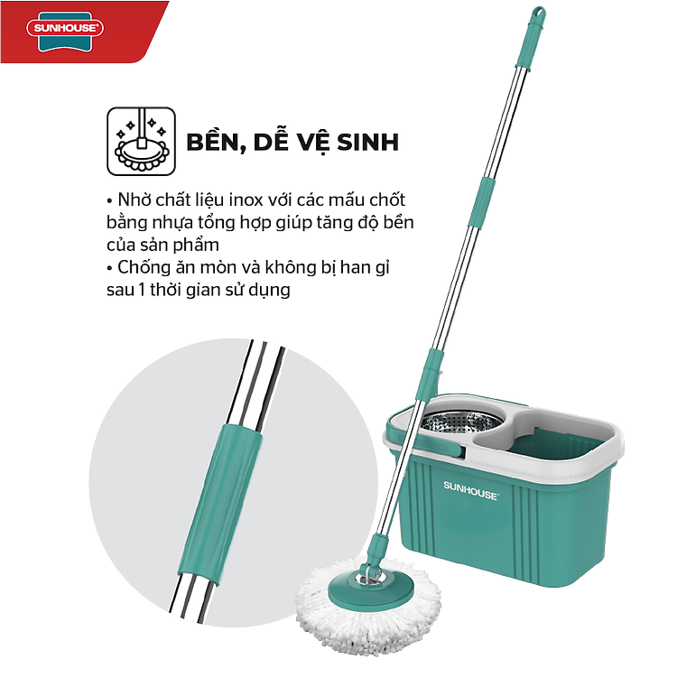 Thùng giặt bằng nhựa chắc chắnBộ lau nhà xoay 360 độ SUNHOUSE KS-CL330S được thiết kế tiện dụng với thùng vắt làm bằng nhựa tổng hợp với 2 màu sắc bắt mắt là xanh lá cây và màu tím. Kích thước phù hợ…