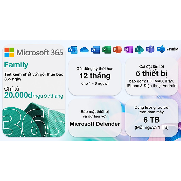 | Đặc điểm nổi bật | Nhận nhanh qua Email trong 1 phút. Sử dụng mới hoặc gia hạn đều được • Trọn bộ phiên bản cao cấp của Word, Excel, PowerPoint, OneNote, Outlook và các ứng dụng khác. Ứng dụng liên tục được cập nhật với các tính năng và phiên bản mới nhất• Lên đến 6 TB dung lượng lưu trữ đám mây OneDrive (kho lưu trữ cá nhân riêng biệt 1TB cho mỗi người).• Outlook hỗ trợ sắp xếp email, lịch biểu, danh bạ, không có quảng cáo• Trình chỉnh sửa video Clipchamp với các bộ lọc và hiệu ứng cao cấp• Nâng cấp Microsoft Teams – Cuộc gọi nhóm lên đến 30 giờ cho 300 người tham gia, tạo phụ đề tiếng Anh tự động cho cuộc họp• Bảo vệ thiết bị và tài liệu quan trọng với khả năng tự động phát hiện virus và bảo mật hai lớp nâng cao Hỗ trợ hệ điều hành: • Windows• MacOS: Sonoma phiên bản 14, Sequoia phiên bản 15, Tahoe phiên bản 26 (chỉ hệ điều hành macOS không hỗ trợ tiếng Việt)• Android• iOS, iPadOS phiên bản 18.0 trở lên Lưu ý: – Đối với sản phẩm key điện tử CHƯA KÍCH HOẠT sẽ KHÔNG có thời hạn sử dụng. Bạn có thể bảo quản key để sử dụng trong tương lai. |