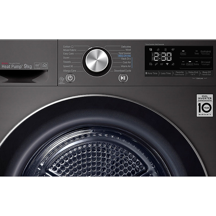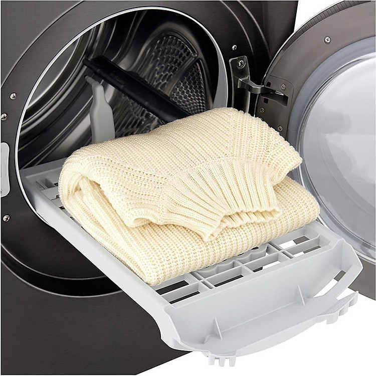 Tiện ích: AI DD – Cảm biến tự động xác định chất liệu sợi vải Chế độ sấy nhiệt độ thấp Chống dị ứng Công nghệ sấy Heatpump Inverter Smart ThinQ giúp điều khiển máy giặt từ xa qua wifi Tự động vệ sinh bộ lọc