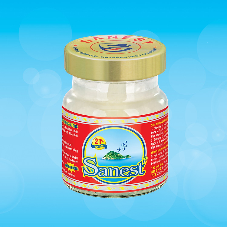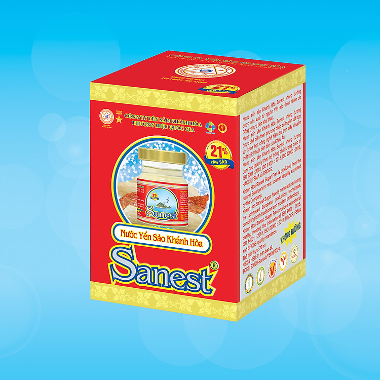 | Thành phần | Có đường: Nước, Yến sào 21%, đường phèn, Fucoidan, chất ổn định (406, 401, 415), chất làm dày (327), hương liệu giống tự nhiên. Không đường: Nước, chất tạo ngọt tổng hợp (953, 950), hương liệu giống tự nhiên. |