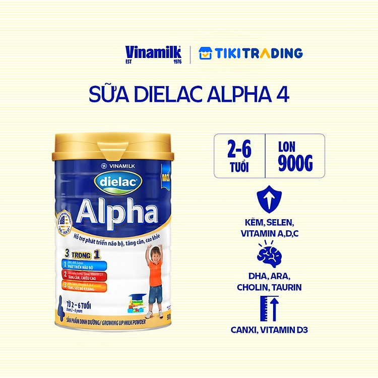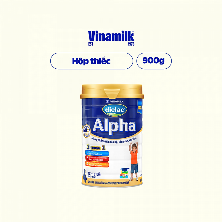 Hỗ trợ phát triển não bộ và thị giácSữa Bột Vinamilk Dielac Alpha 4 (900g / Hộp Thiếc) với công thức 3 trong 1 cung cấp đầy đủ các dưỡng chất thiết yếu hỗ trợ phát triển não bộ, giúp tăng cân, chiều …