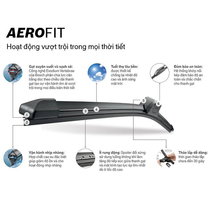 Thanh cần gạt nước mưa xe hơi xương mềm thương hiệu cao cấp Bosch – Kích thước từ 14 inch đến 26 inch – Hàng Nhập Khẩu