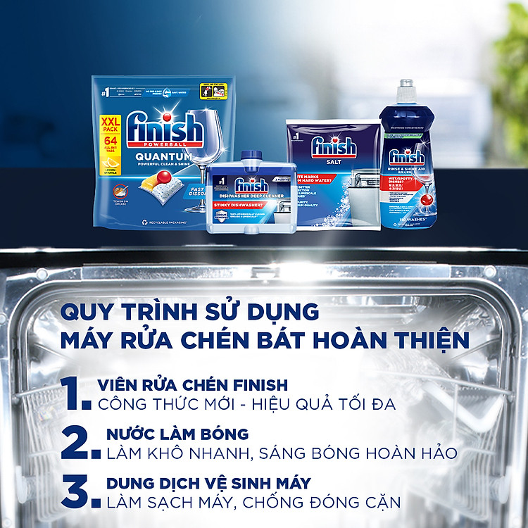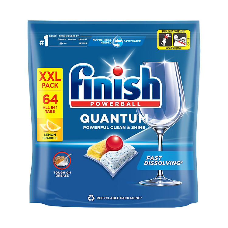 Túi 64 Viên Rửa Chén Bát Finish Powerball Quantum 12x sức mạnh, túi lớn siêu tiết kiệm