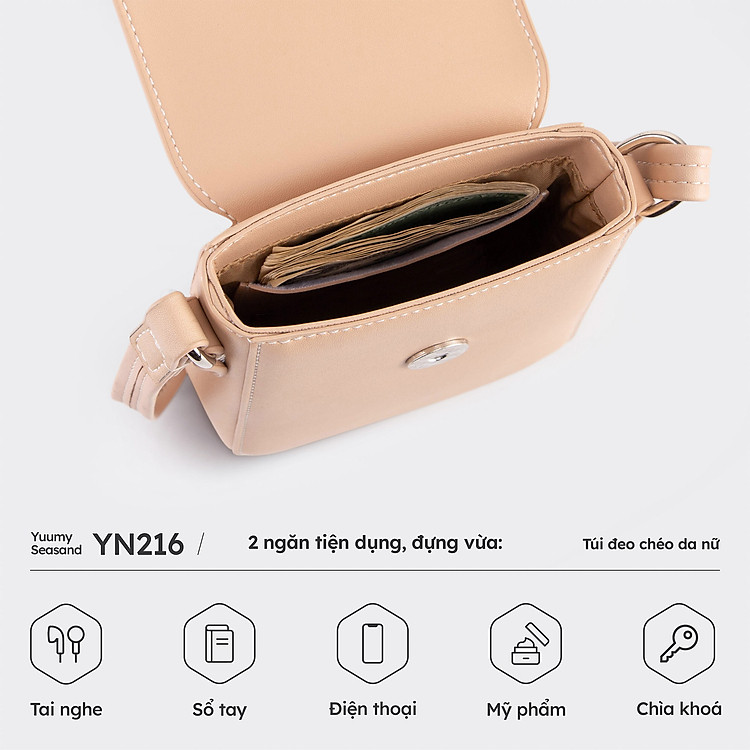 Túi đeo chéo da nữ mini xinh xắn kiểu dáng basic Yuumy Seasand YN216 có dáng hình chữ nhật đứng, kết hợp cùng các đường bo cong mềm mại, cuốn hút. Túi làm từ chất liệu da tổng hợp cao cấp c…
