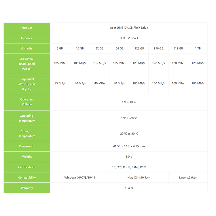 USB 3.2 Gen 1 Acer UM310 SuperSpeed dung lượng 32GB I 64GB I 128GB I 256GB I Bảo hành 5 nămAcer giới thiệu Flash USB thế hệ mới với hiệu suất nhanh hơn và nhiều không gian lưu trữ hơn. Acer UM310 là g…