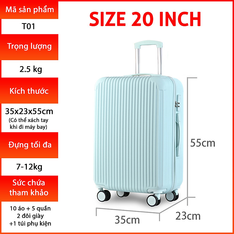 | Kích thước | Kích thước sản phẩm: ��� Size 20: 36.5cm x 25.5cm x 53cm(+/- 2cm), có thể xách tay lên máy bay, sức chứa 7-12kg hành lý, thích hợp cho những chuyến du lịch ngắn ngày 2-4 ngày hoăc đi công tác. ��� Size 24: 42.5cm x 28.5cm x 63cm (+/- 2cm);cần phải ký gửi, đựng được 20-25kg hành lý, thích hợp 2-4 người dùng đi du lịch dài ngày hoặc công tác 5-7 ngày. |