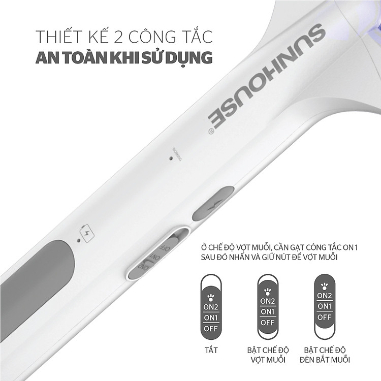 Đặc điểm nổi bậtVợt muỗi thông minh 3in1 Sunhouse SHE-PRO11.W tích hợp 3 chức năng: vợt muỗi + dèn diệt muỗi + đèn ngủ.Vợt có kiểu dáng gọn nhẹ với màu trắng sang trọng tạo nên chiếc vợt vừa hiện đ…